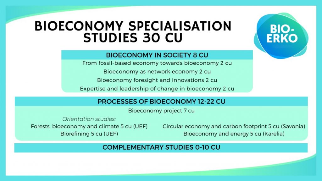 The University of Eastern Finland, Karelia University of Applied Sciences, and Savonia University of Applied Sciences have provided the bioeconomy specialisation education in Eastern Finland since 2018. Education is targeted for the people who work, or will be working, in the field of bioeconomy in companies, consultation or promotion tasks, or as vocational teachers, or who operate in the public sector to promote bioeconomy. The training is suited for entrepreneurs or individuals who aim to become entrepreneurs in the field of, for example, bio-based production and raw material procurement for bioproducts. The applicants must have a suitable university degree or other degree suitable for the field of bioeconomy.
